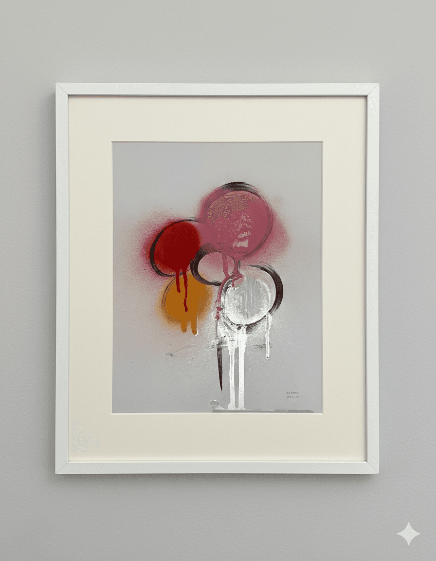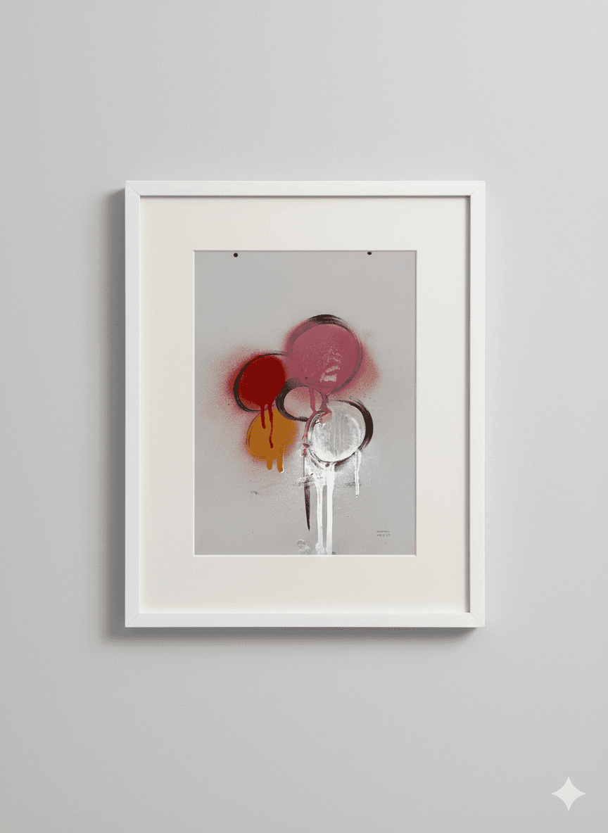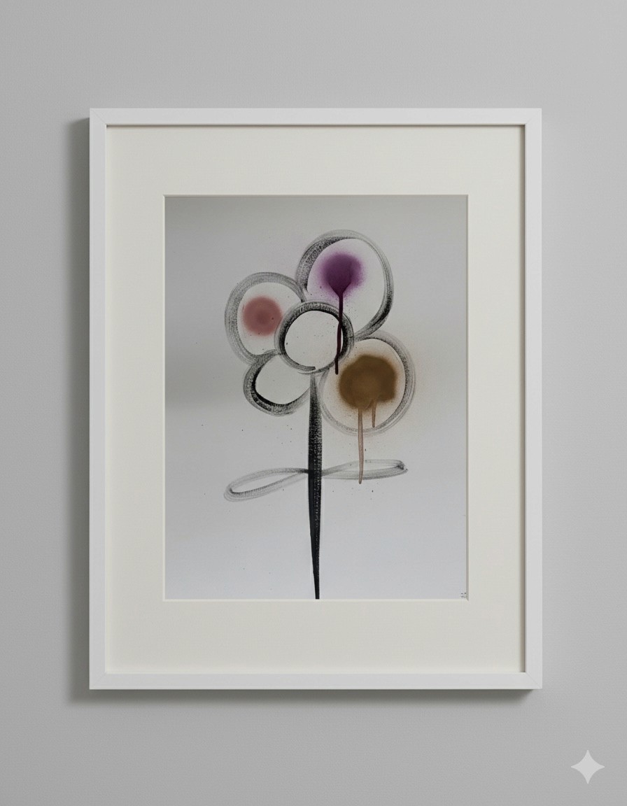 The BLUMENWIESE series are available in two sizes, small and large. The works are painted on smooth cotton rag, presented with acrylic and spray paint. The small ones are in A4 format. The large ones are in A2 format. Each work is hand-signed by the artist on the front.